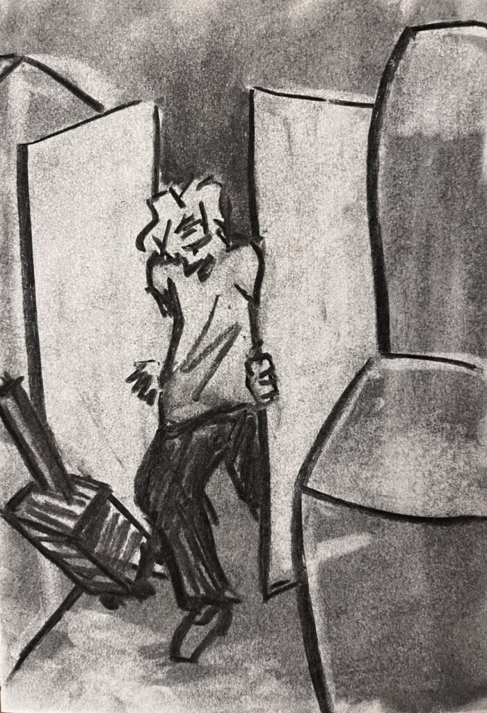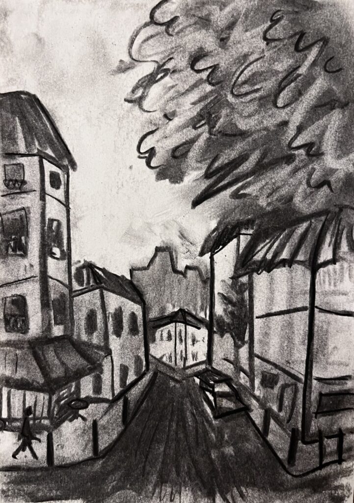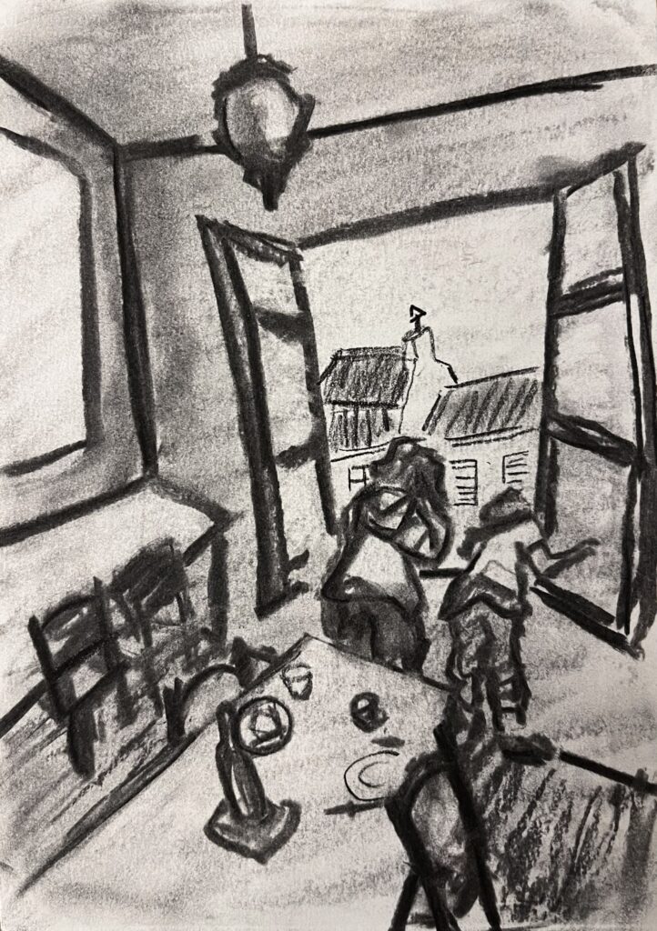 “A Street in Paris”, 2025, Charcoal on paper, 10 x 15 cm.“Football Guy at Montmartre, 2025, Charcoal on paper, 21 x 29,7 cm.“Koppel op de stenen in Sète”, 2024, Charcoal on paper, A5.“Stoel met Kussens”, 2024, Charcoal on paper, A3.“Oorlog in het Bos”, 2025, Charcoal on paper, A3.“Clara op de Bank”, 2025, Charcoal on paper, A4.“Jongen in Het Raam”, 2025, Charcoal on paper, 17 x 13,7 cm.“Schommeljoch”, 2025, Charcoal on paper, 32 x 32cm.“Mountain in the Pyrenees”, 2025, Charcoal on paper, 14,8 x 10,5 cm.“Caught”, 2025, Charcoal on paper, 10 x 15 cm.“Op de vloer”, 2024, Charcoal on paper, A3.“Looking Out of The Window”, 2025, Charcoal on paper, 21 x 29,7 cm.“Man in Parc Montsouris”, 2025, Charcoal on paper, 21 x 29,7 cm.“Looking Out of The Window”, 2025, Charcoal on paper, 10 x 15 cm.Zelf portret, 2024, Charcoal on paper, A3.“Barfight”, 2025, Charcoal on paper, 21 x 29,7 cm.“Chocola likker”, 2024, Charcoal on paper, A3.“Drijven”, 2025, Charcoal on paper, 10 x 15 cm.